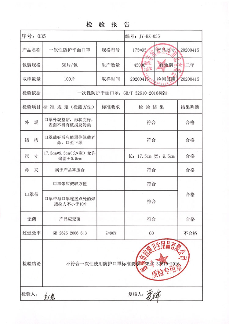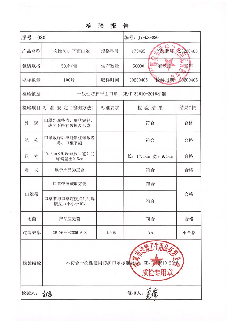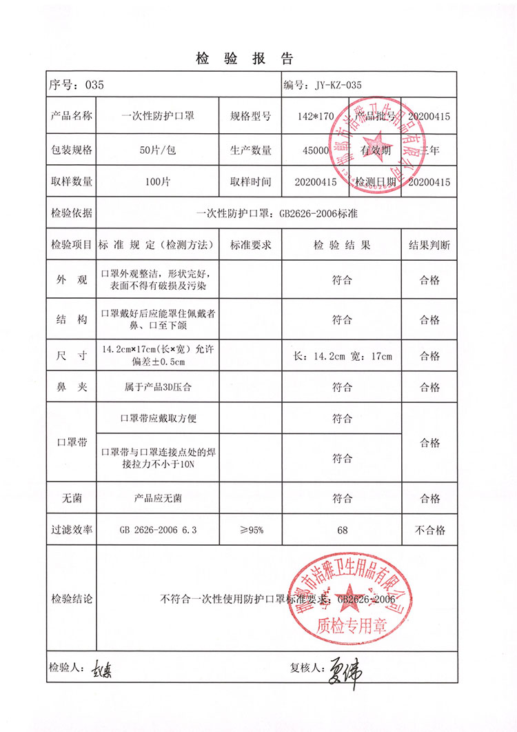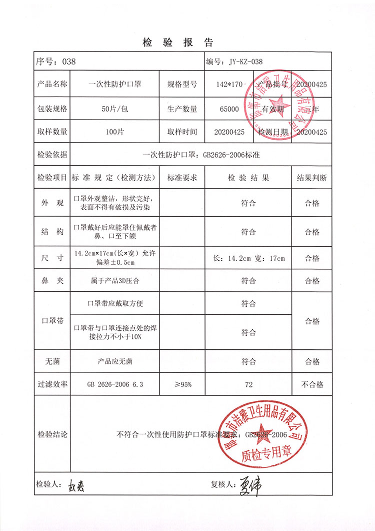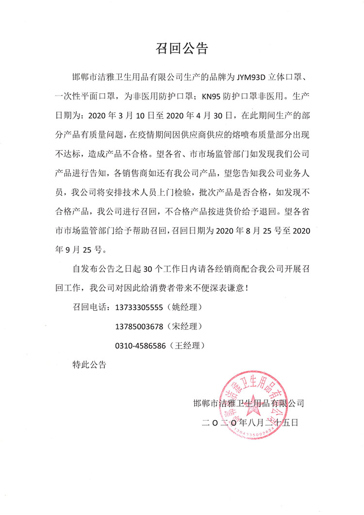邯鄲市潔雅衛(wèi)生用品有限公司生產的品牌為JYM93D立體口罩一次性平面口罩,為非醫(yī)用防護口罩;KN95 防護口罩非醫(yī)用。生產日期為:2020年3月10日至2020年4月30日,在此期間生產的部分產品有質量問題,在疫情期間因供應商供應的熔噴布質量部分出現不達標,造成產品不合格。望各省、市市場監(jiān)管部門如發(fā)現我們公司產品進行告知,各銷售商如還有我公司產品,望您告知我公司業(yè)務人員,我公司將安排技術人員上門檢驗,批次產品是否合格,如發(fā)現不合格產品,我公司進行召回,不合格產品按進貨價給予退回。望各省市市場監(jiān)管部門給予幫助召回召回日期為2020年8月25號至2020年9月25號